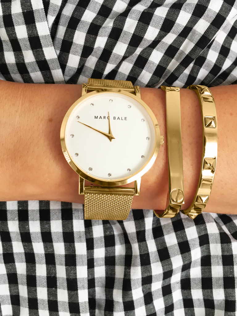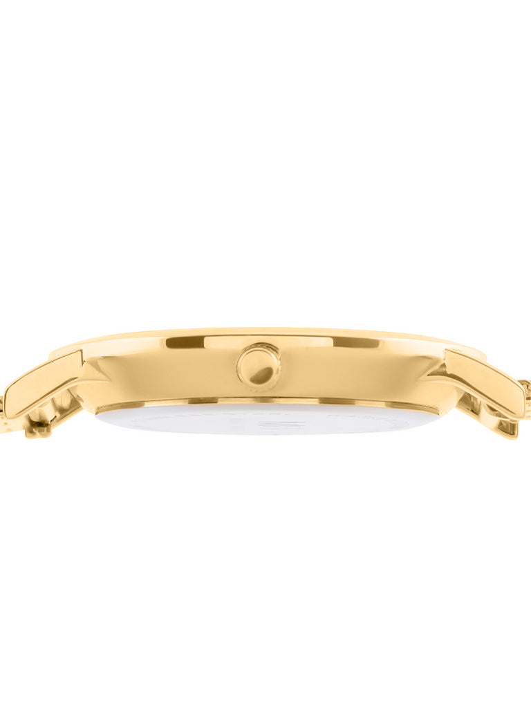 The watch is crafted with a refined gold-plated stainless steel case, combining sophistication with lasting durability.