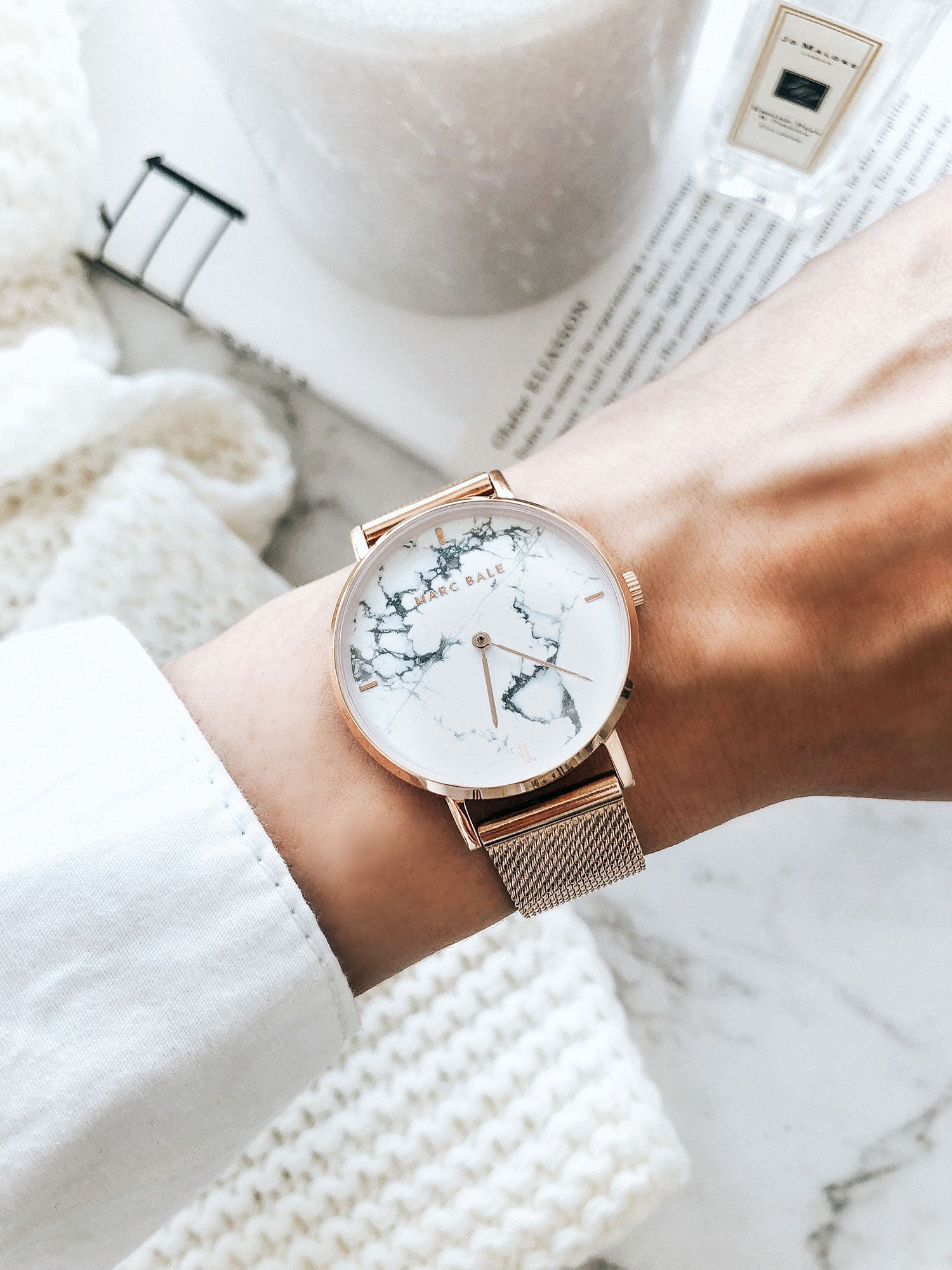 Elegantly designed, the watch features fine baton-style hands in rose gold, paired with minimalist hour markers at the 12, 3, 6, and 9 positions. The minimalist design accentuates the striking marble dial, making this watch a statement piece that effortlessly enhances any outfit.