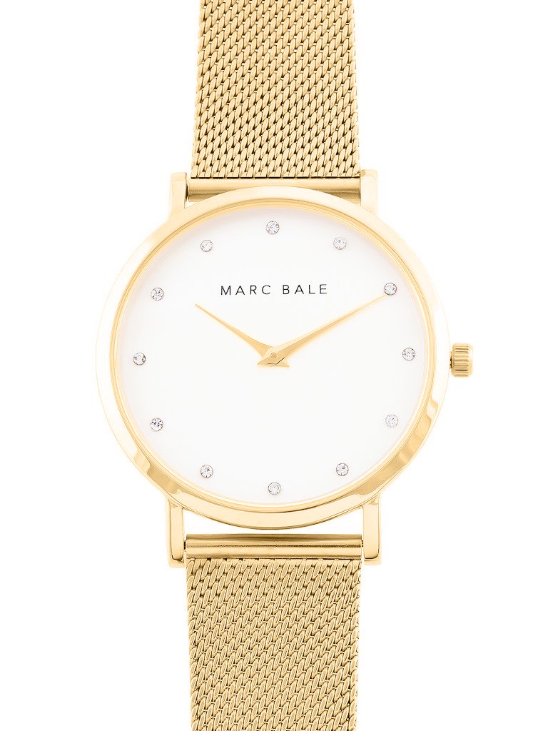 The Brillance Classique watch by Marc Bale features an elegantly adorned eggshell white dial with radiant Swarovski crystals. This exclusive design enhances our signature large twelve-index dial, giving it a fresh and luminous appearance, making it suitable for both daily wear and formal occasions.