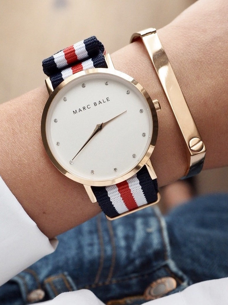 De Brillance True Blue Classique voegt een vleugje authentiek Australisch karakter toe aan je pols met de verwisselbare stoffen band in blauw, wit en rood.