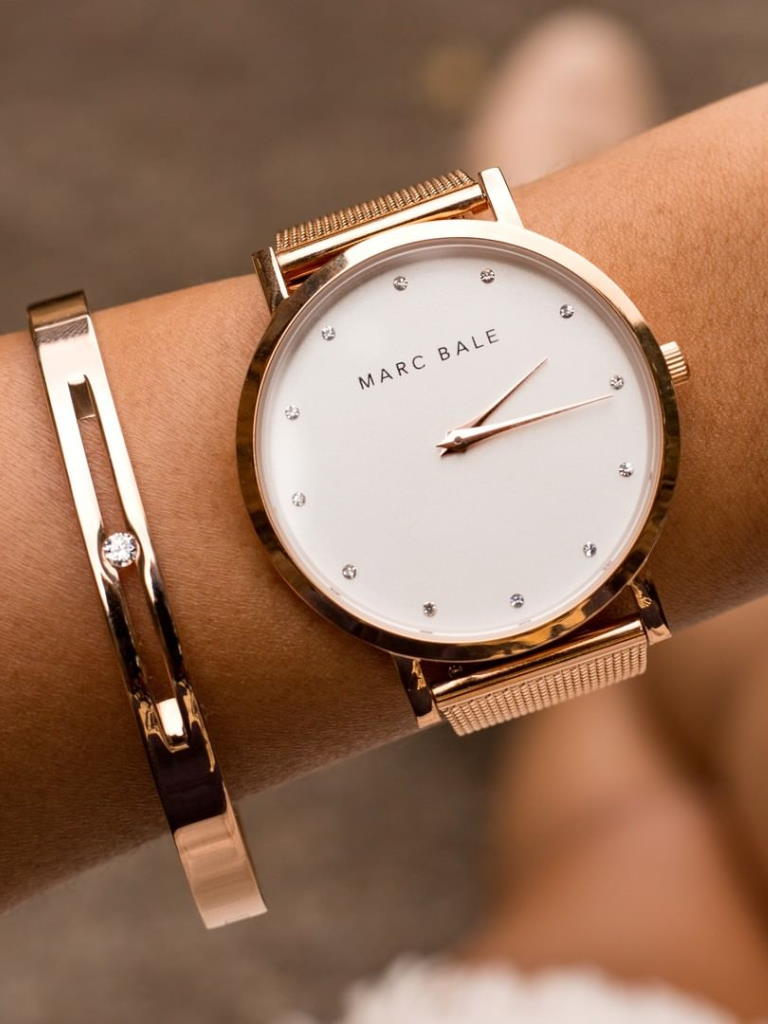 Zegarek jest wykonany z wyrafinowanej, złoconej różowym złotem obudowy ze stali nierdzewnej, która łączy w sobie elegancję z trwałością.